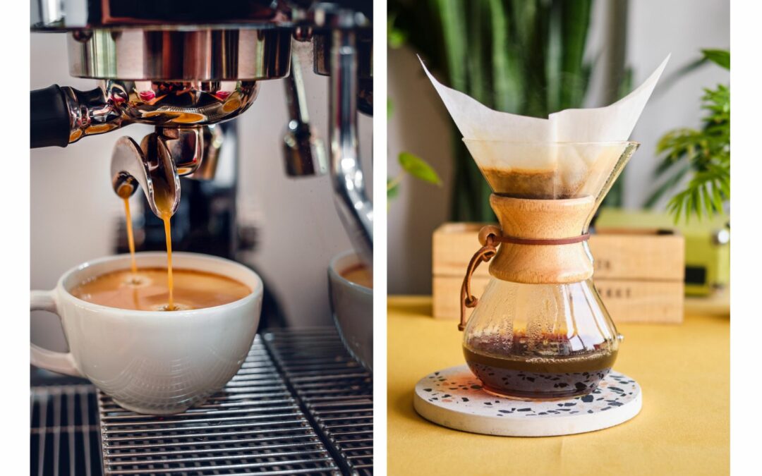 Foto que muestra la diferencia entre el método de extracción para un café espresso y un café filtrado en Chemex